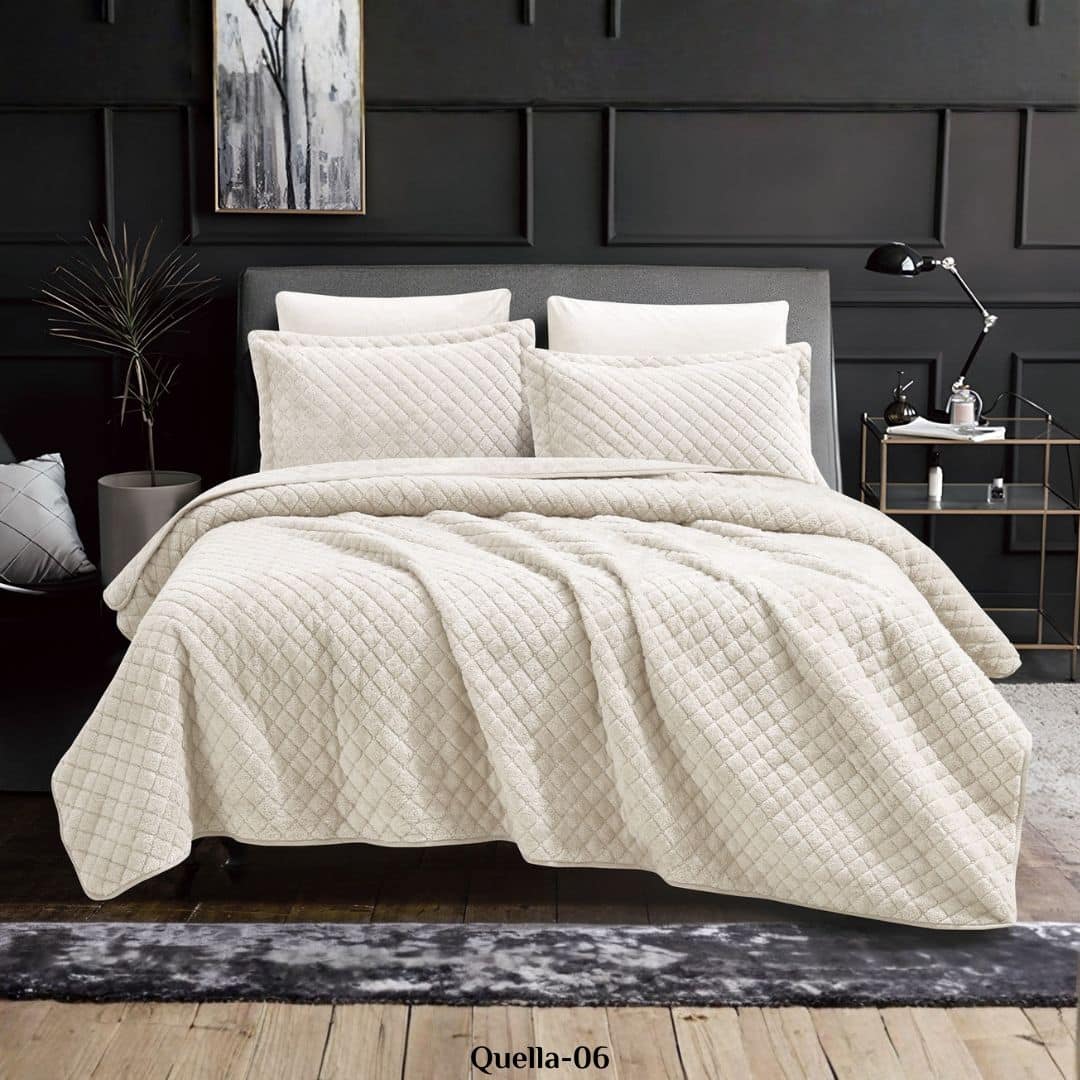 يتميز هذا المفرش بملمس فخم يعبّر عن جودة الخامة وروعة الحياكة، مع خامة مخملية لامعة تعكس الضوء برقة وتمنح السرير مظهرًا غنيًا يليق بالفنادق الفاخرة.
