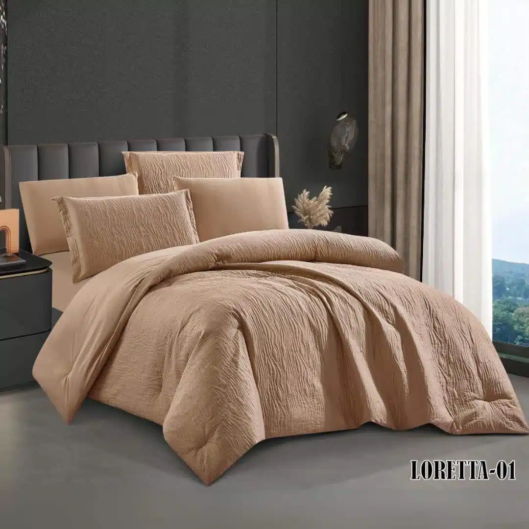 امنح سريرك لمسة من الرقي والفخامة مع هذا اللحاف المصنوع من خام الالترا سونيك حفر ليزري فاخر، المعروف بملمسه الحريري ونعومته الاستثنائية. يتميز بخفة وزنه ومرونته ليمنحك الراحة التامة طوال الليل، مع قدرة عالية على الانسياب فوق السرير بأناقة.